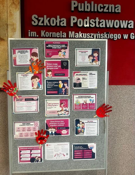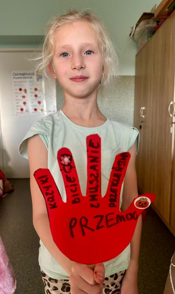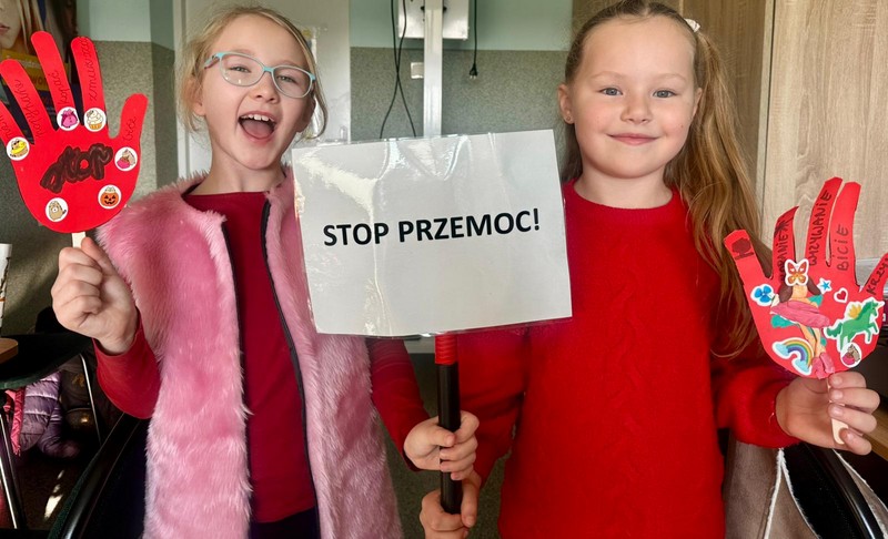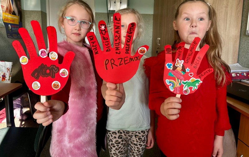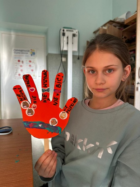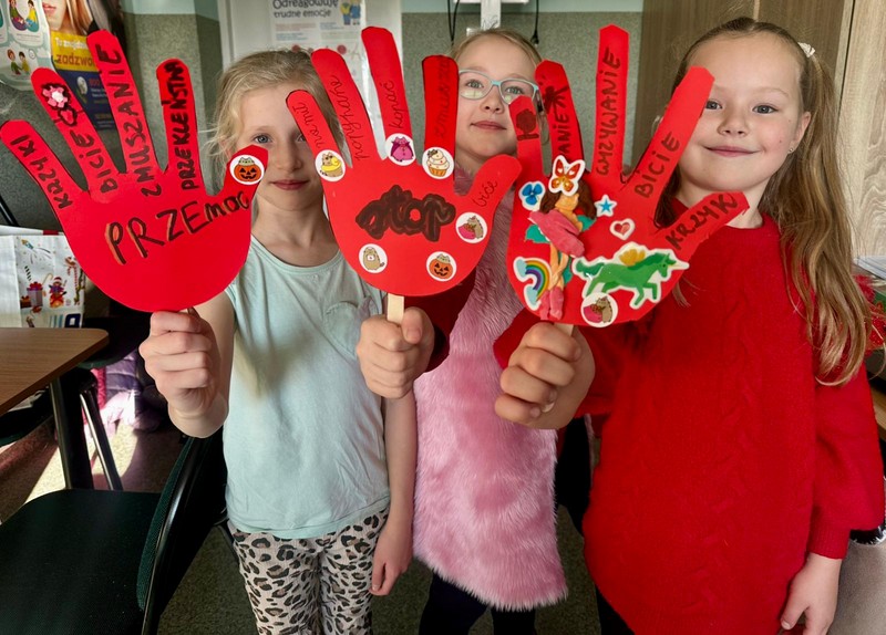 Zorganizowaliśmy konkurs plastyczny pt. „Dzieciństwo bez przemocy”, a na zajęciach rozmawialiśmy o rodzajach przemocy oraz jak ją rozpoznać i gdzie zgłosić.