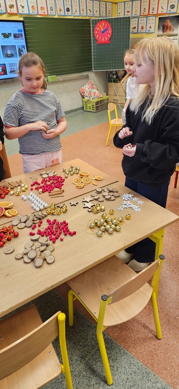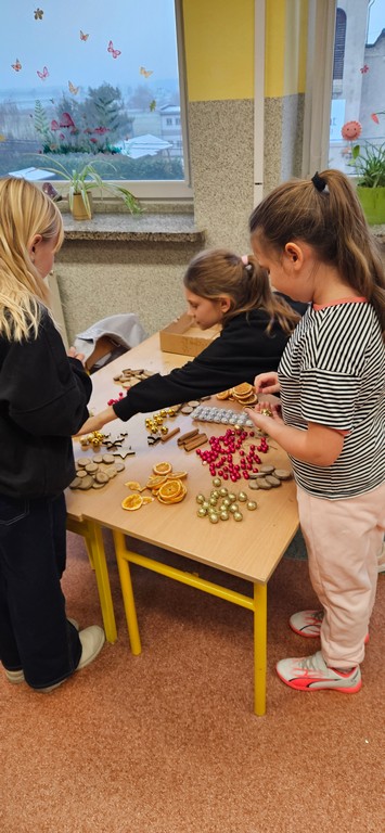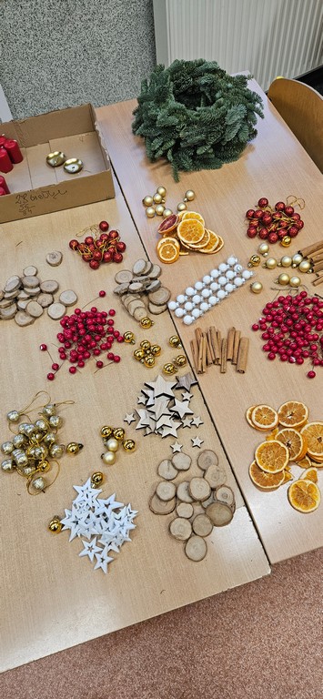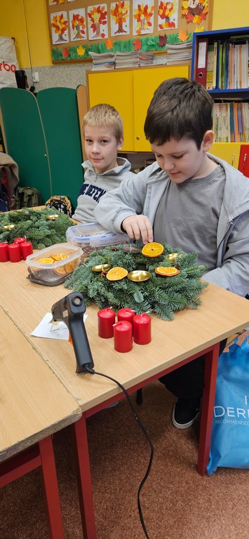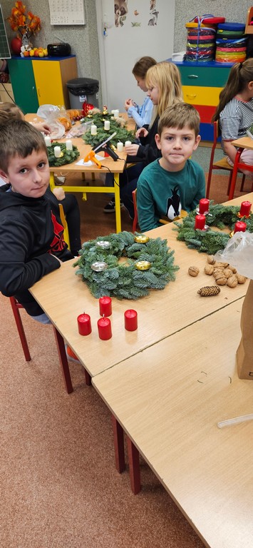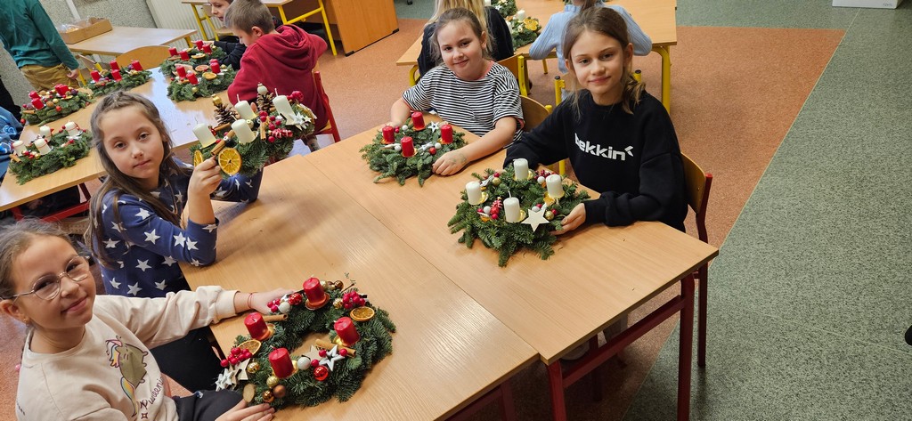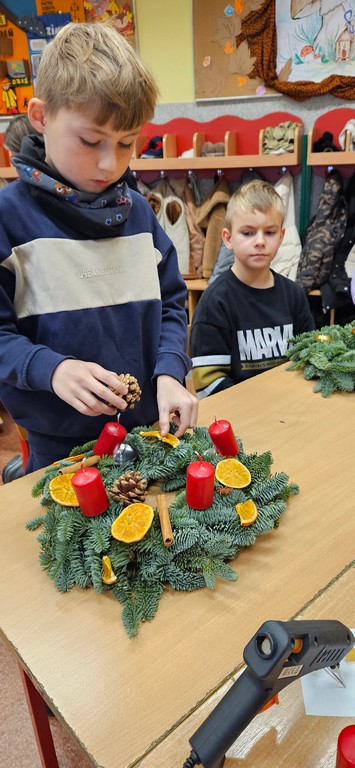 Podczas zajęć panowała twórcza i radosna atmosfera. Uczniowie z dużym zaangażowaniem komponowali swoje wieńce, dobierając świece i ozdoby według własnych pomysłów. Dzięki wspólnej pracy powstały piękne, różnorodne kompozycje, które wprowadziły w klasie adwentowy nastrój.