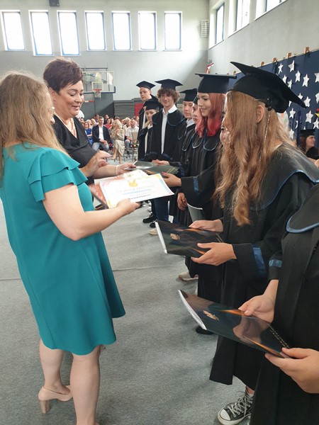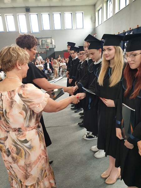 Kolejno odbyło się pożegnanie klas ósmych, które rozpoczęło się krótkimi przemówieniami wychowawców: pani Krystyny Skoczylas i pani Anny Wiory. Następnie pani dyrektor wręczyła nagrody uczniom wyróżnionym oraz listy gratulacyjne rodzicom tych uczniów a także podziękowała rodzicom za współpracę. Na koniec rozdano świadectwa wszystkim naszym absolwentom.